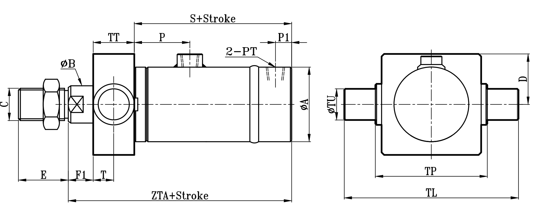 | 缸徑 BORE | ΦA(chǔ) | ΦB | C | E | F | F1 | P | P1 | PT | S | T | ZT | ZTA | ZTC | ΦTU | TL | TP | TT | D |