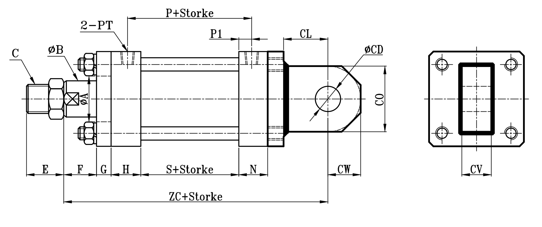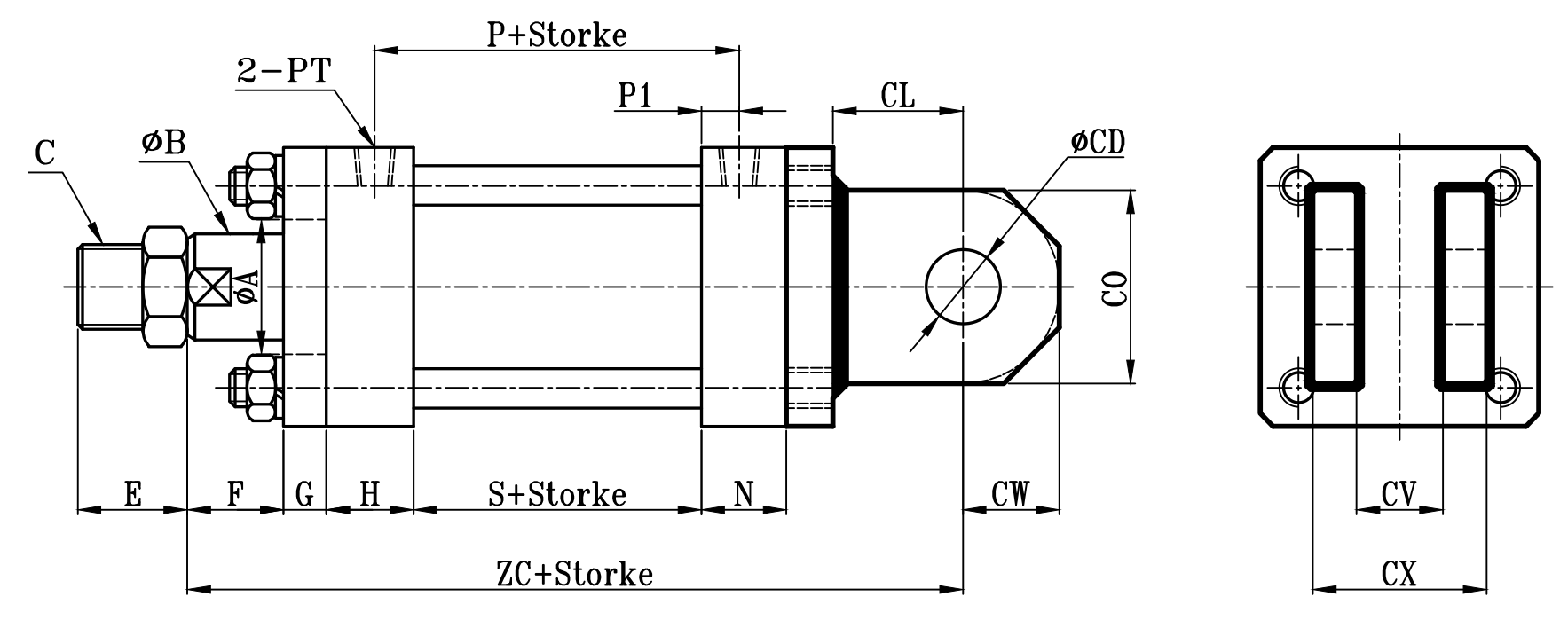 | 缸徑 BORE | ΦA(chǔ) | ΦB | C | E | F | G | H | N | P | P1 | PT | S | ZC | CL | CW | ΦCD | CO | CV | CX |